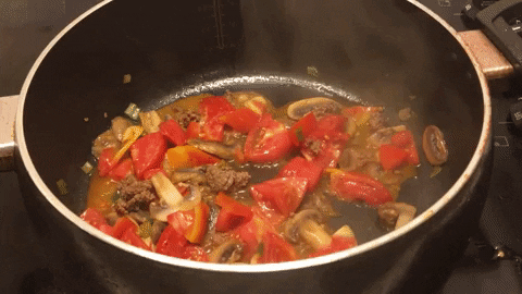 Once the ground beef is browned, add tomatoes and turn the stove to medium. Lightly season with salt and stir. Cover the pot to render out tomato juice. You’re basically making tomato sauce.