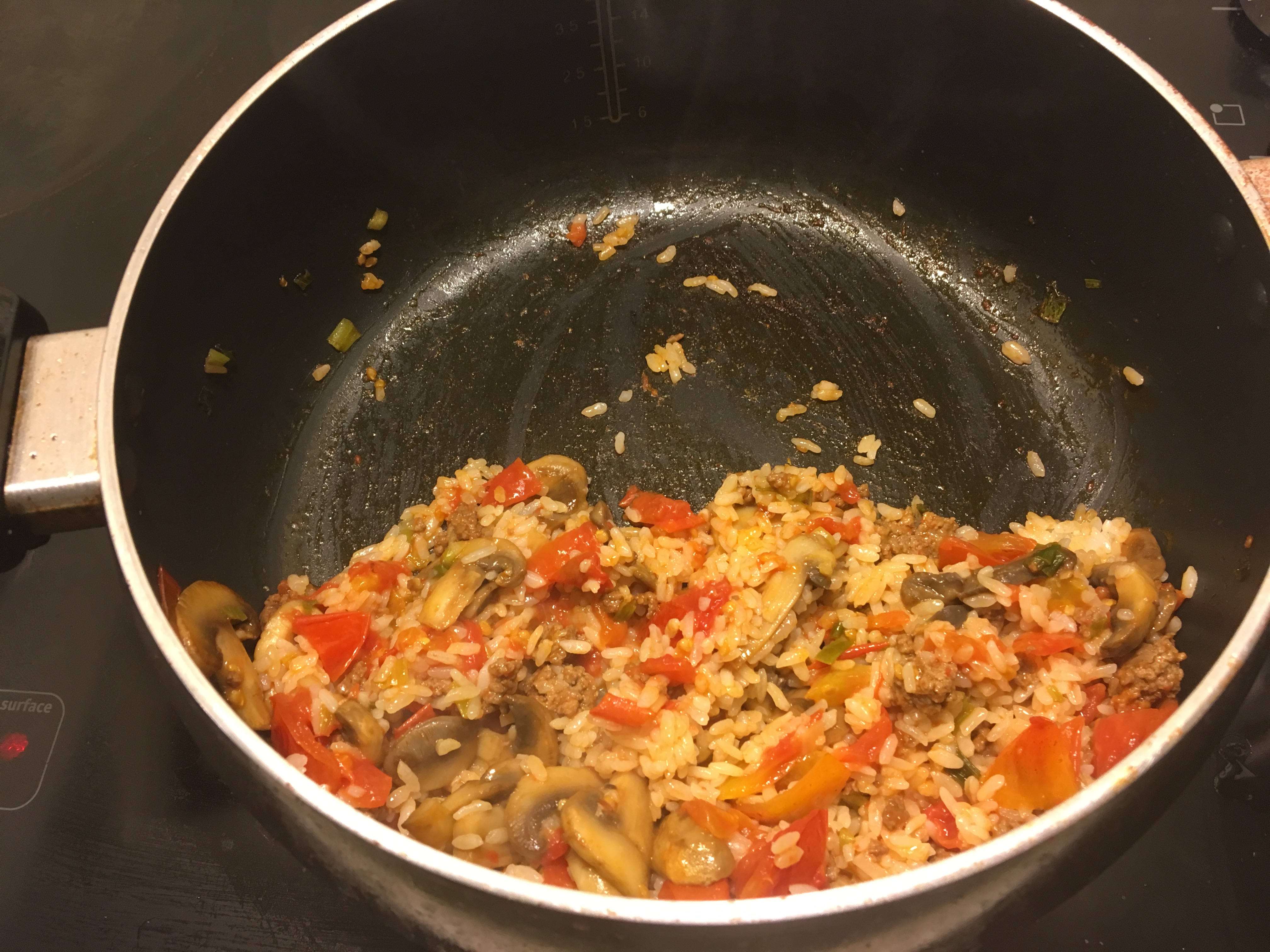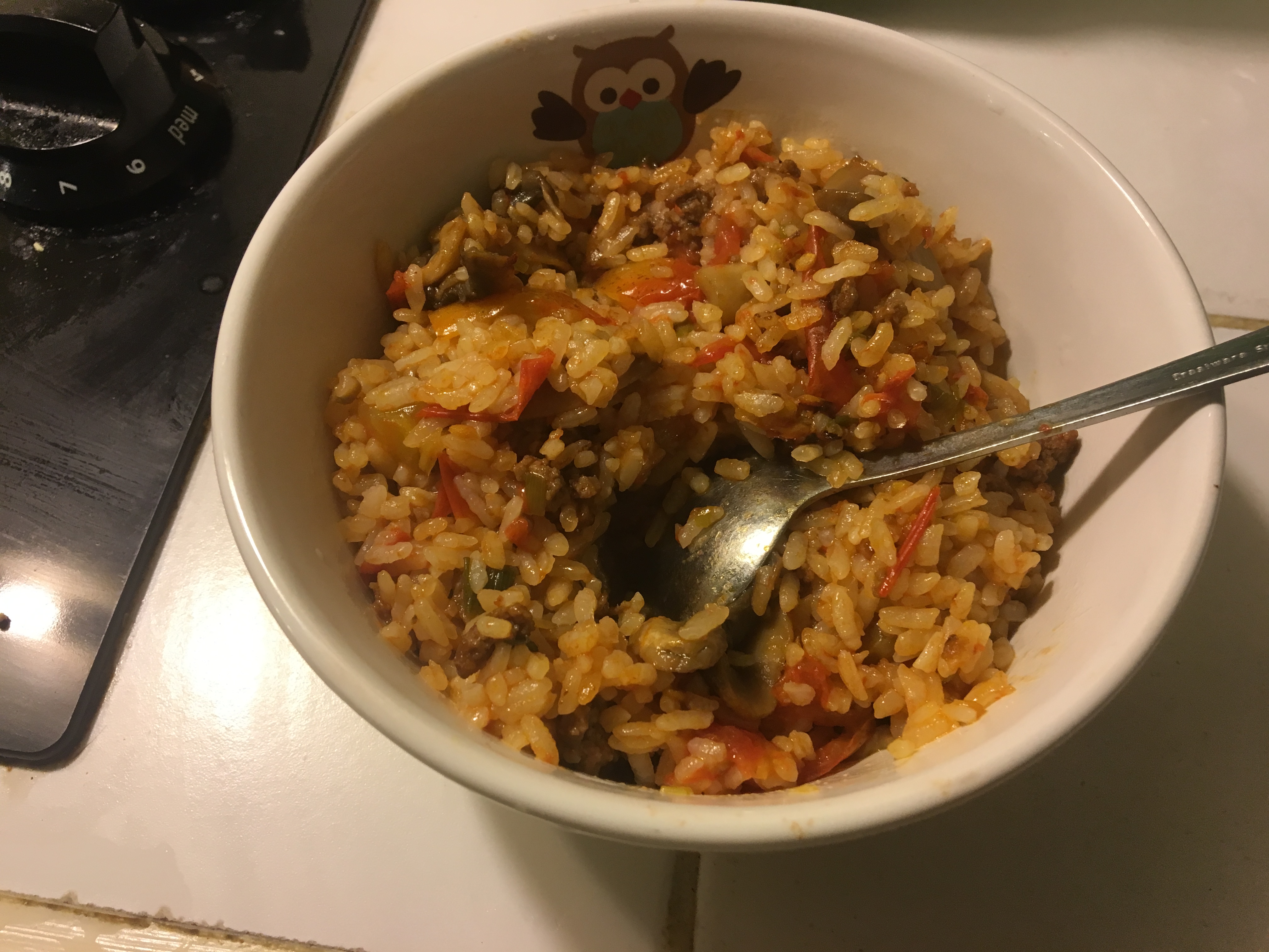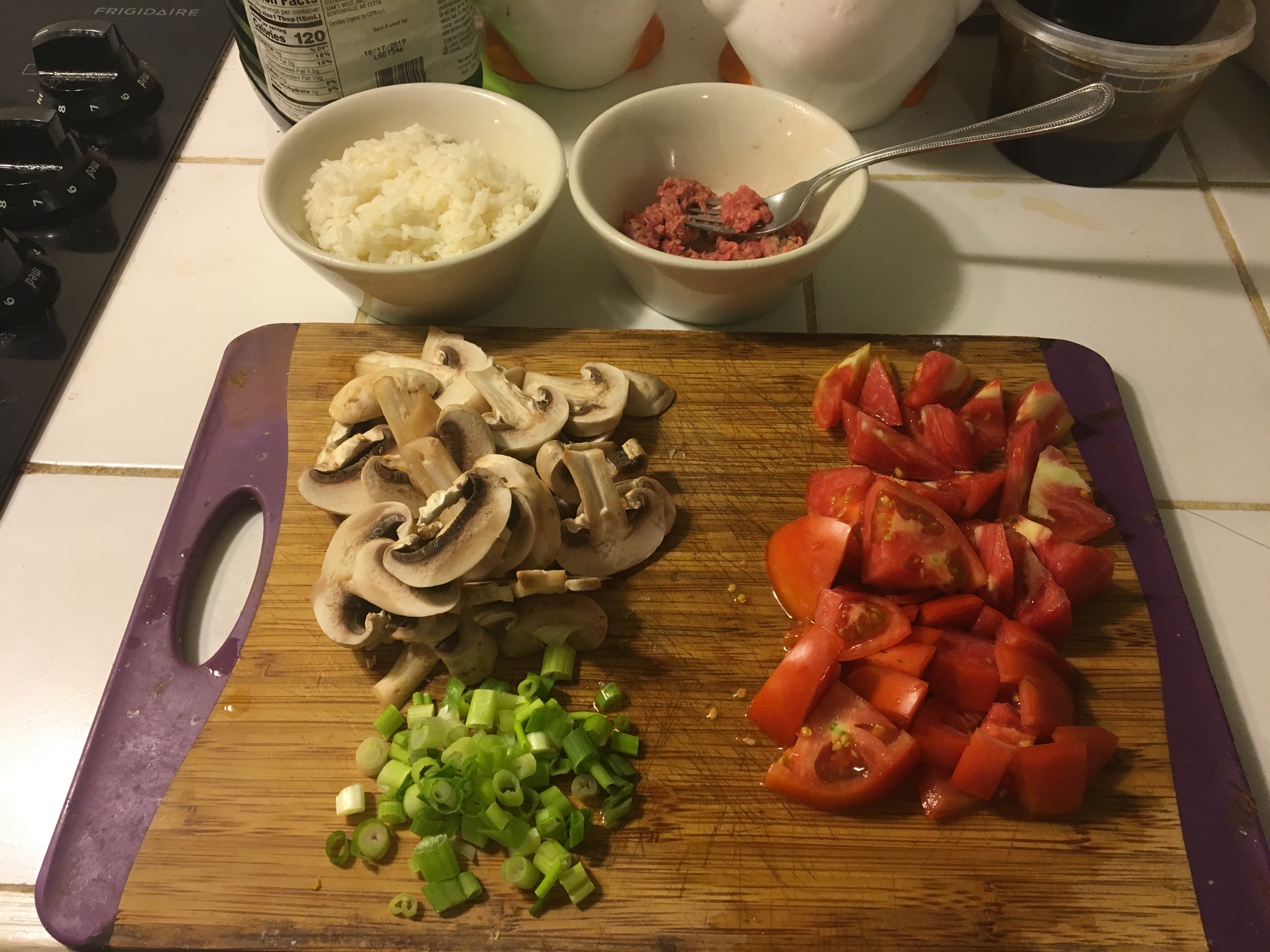 From my fridge, I scavenged leftover white rice (a little over a cup), the last of the mushrooms (five ish), and about a third of the remaining ground beef (I… don’t know how to measure food).